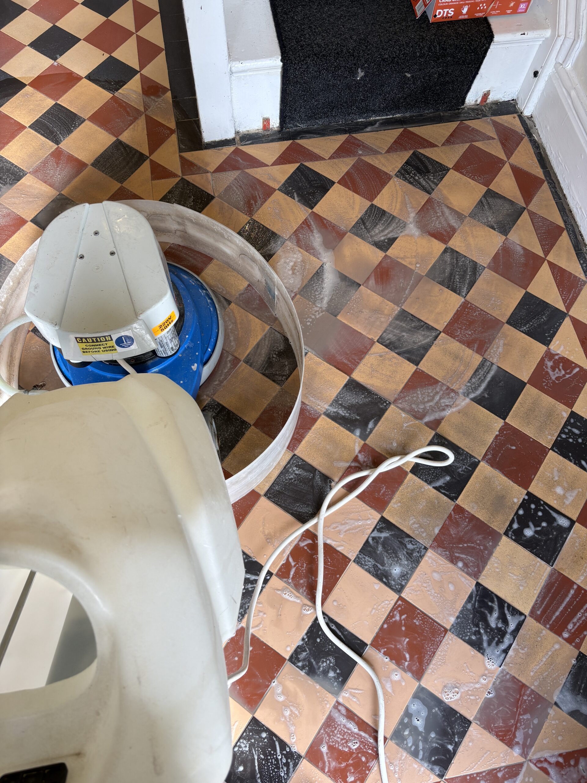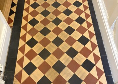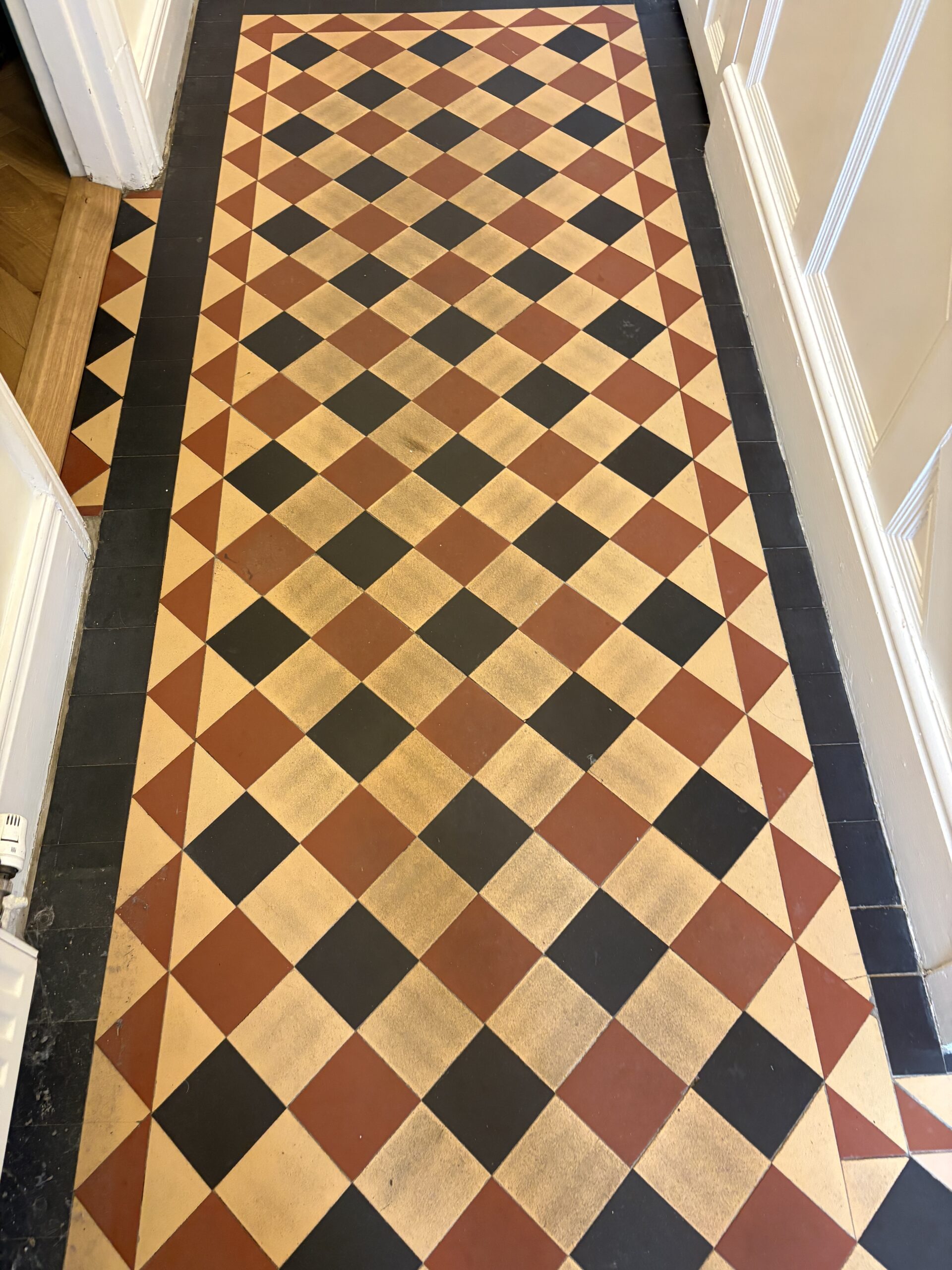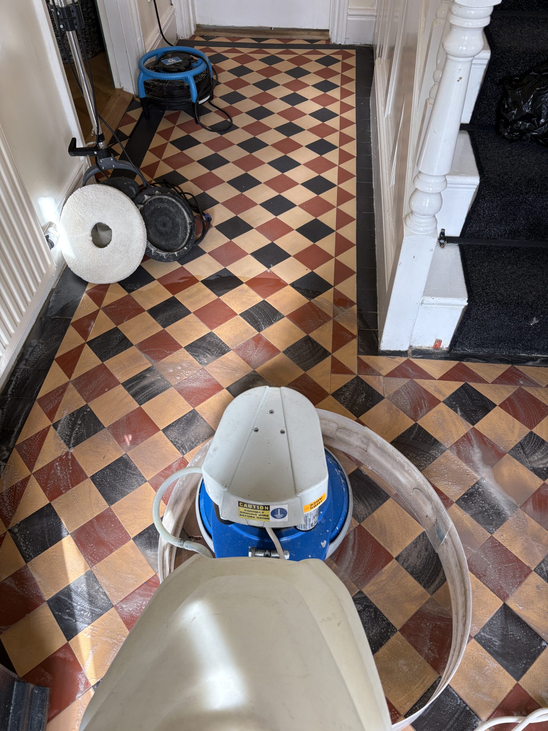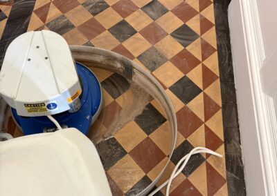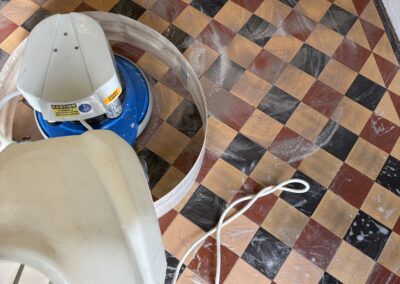 We began with a thorough deep clean of the floor. The difference was actually amazing, the floor released years of built up dirt. Luckily unlike many period floors this one didn’t have layers of topical seals that needed removing. We began with our alkaline deep clean using Faber products. These were worked with our smaller rotary machine before being extracted and the process repeated. Once the dirt was removed we moved onto a pad clean with a Ph neutral cleaner and than padded the floor dry with white terry towels.