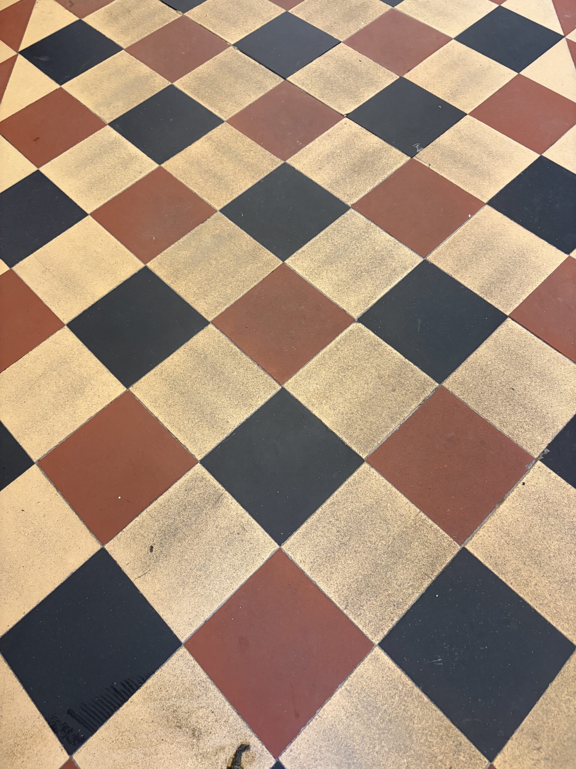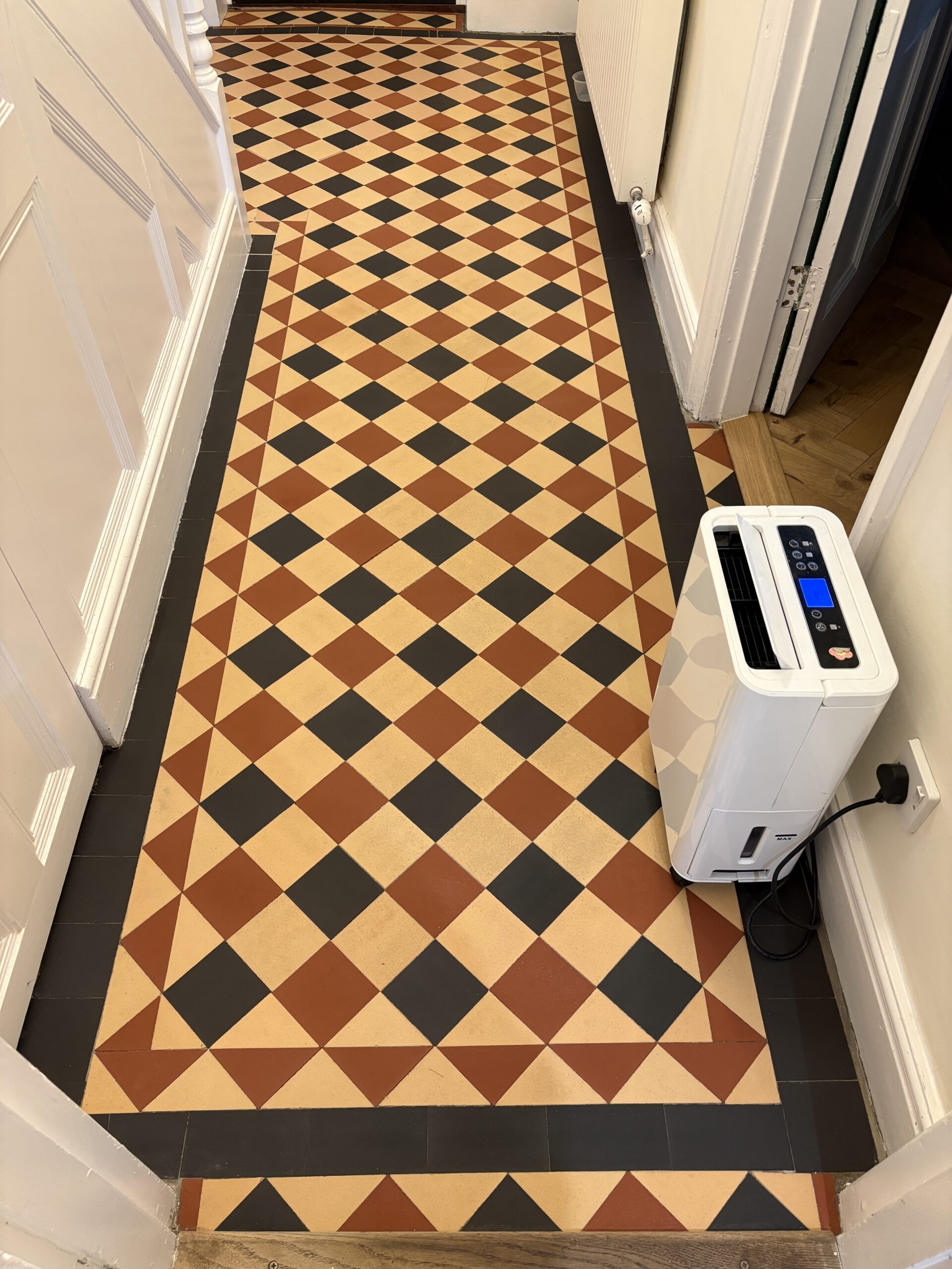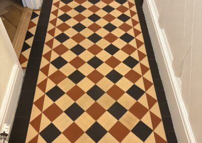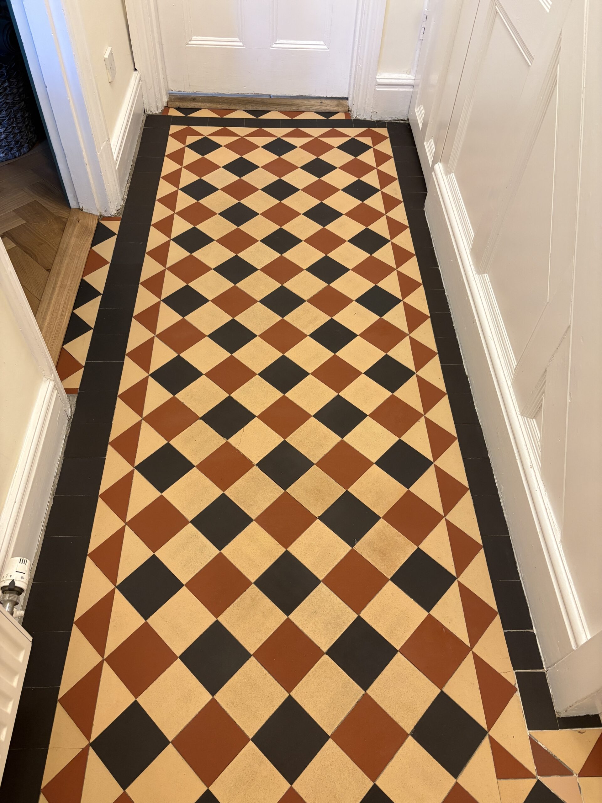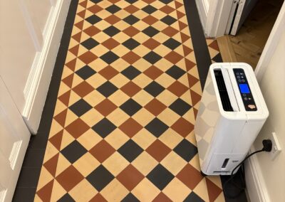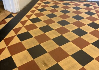 We began with a thorough deep clean of the floor. The difference was actually amazing, the floor released years of built up dirt. Luckily unlike many period floors this one didn’t have layers of topical seals that needed removing. We began with our alkaline deep clean using Faber products. These were worked with our smaller rotary machine before being extracted and the process repeated. Once the dirt was removed we moved onto a pad clean with a Ph neutral cleaner and than padded the floor dry with white terry towels.
